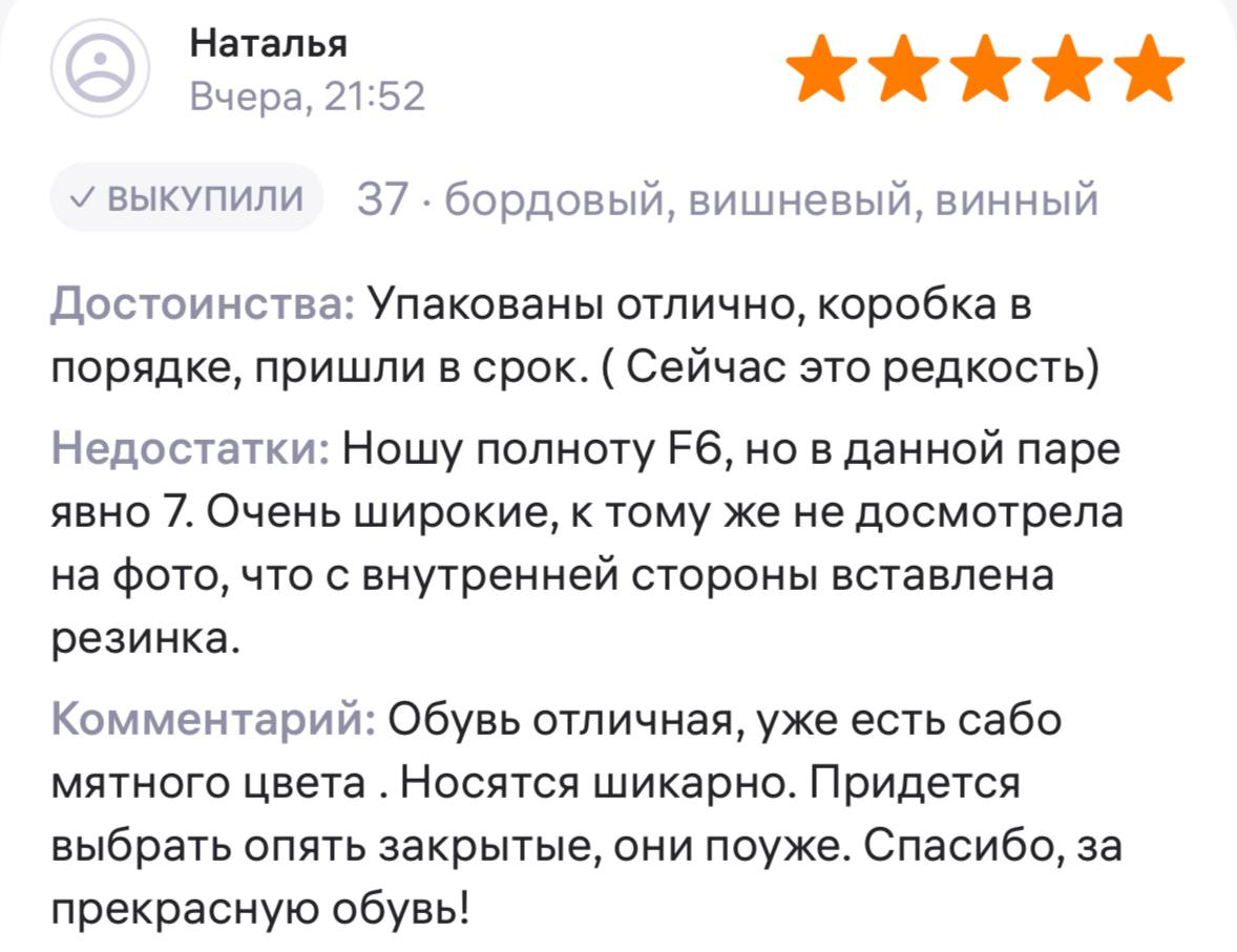 Ботинки хорошие, кажа мягкая, размеру соответствуют, но на пятке пришита заплатка из какой то пленки блесящей и когда первый раз померла она вся сморщилась и такое впечатление что сейчас лопнет. И я думаю со временем так и будет. Если бы не эта заплатка взяла бы удобные и мягкие