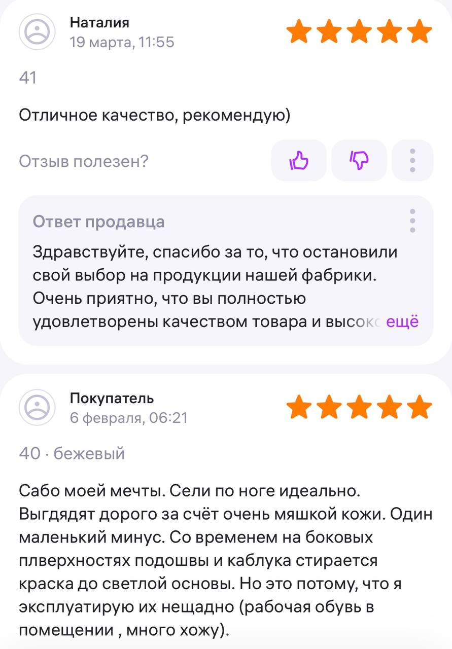 Ботинки хорошие, кажа мягкая, размеру соответствуют, но на пятке пришита заплатка из какой то пленки блесящей и когда первый раз померла она вся сморщилась и такое впечатление что сейчас лопнет. И я думаю со временем так и будет. Если бы не эта заплатка взяла бы удобные и мягкие