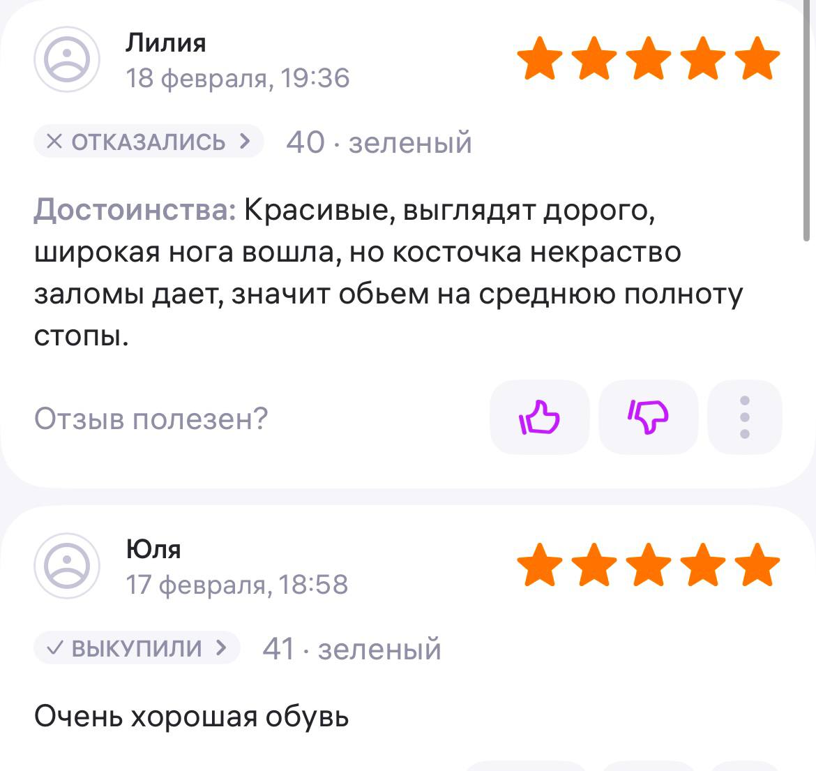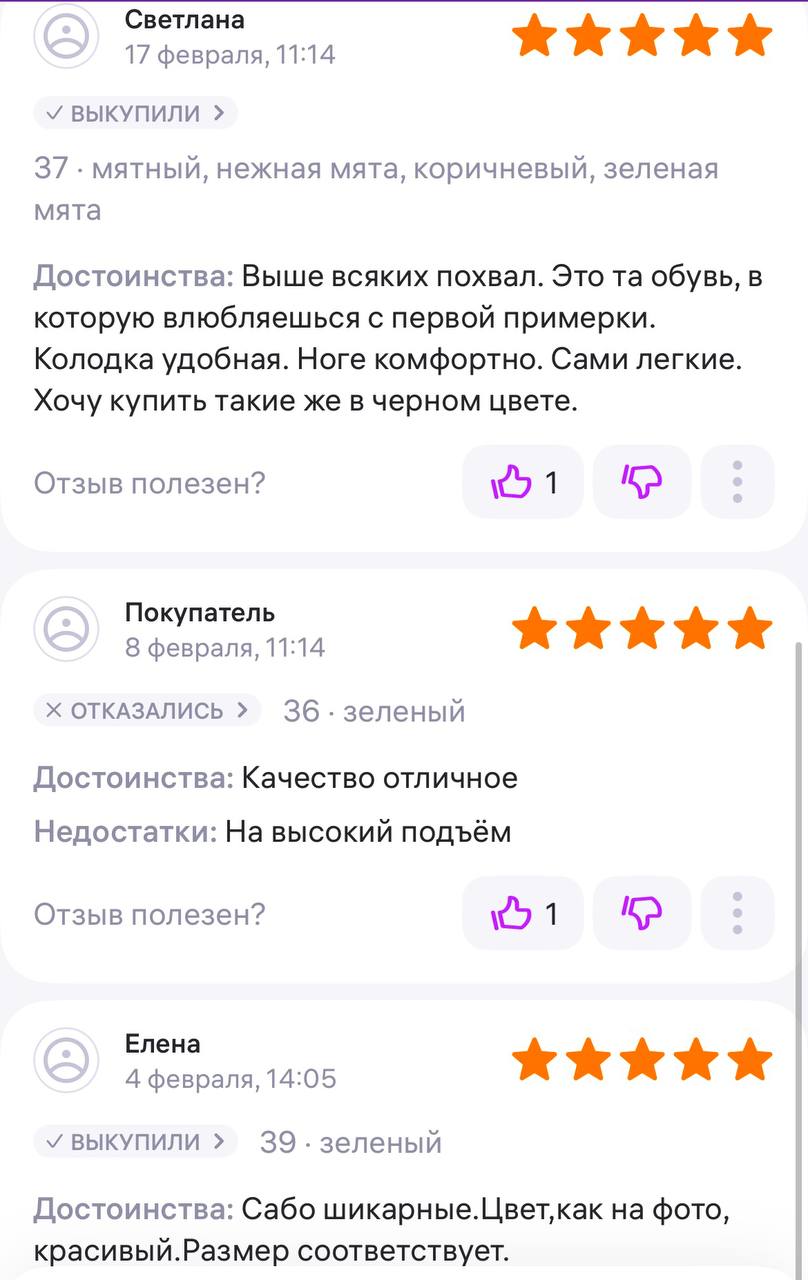 Ботинки хорошие, кажа мягкая, размеру соответствуют, но на пятке пришита заплатка из какой то пленки блесящей и когда первый раз померла она вся сморщилась и такое впечатление что сейчас лопнет. И я думаю со временем так и будет. Если бы не эта заплатка взяла бы удобные и мягкие